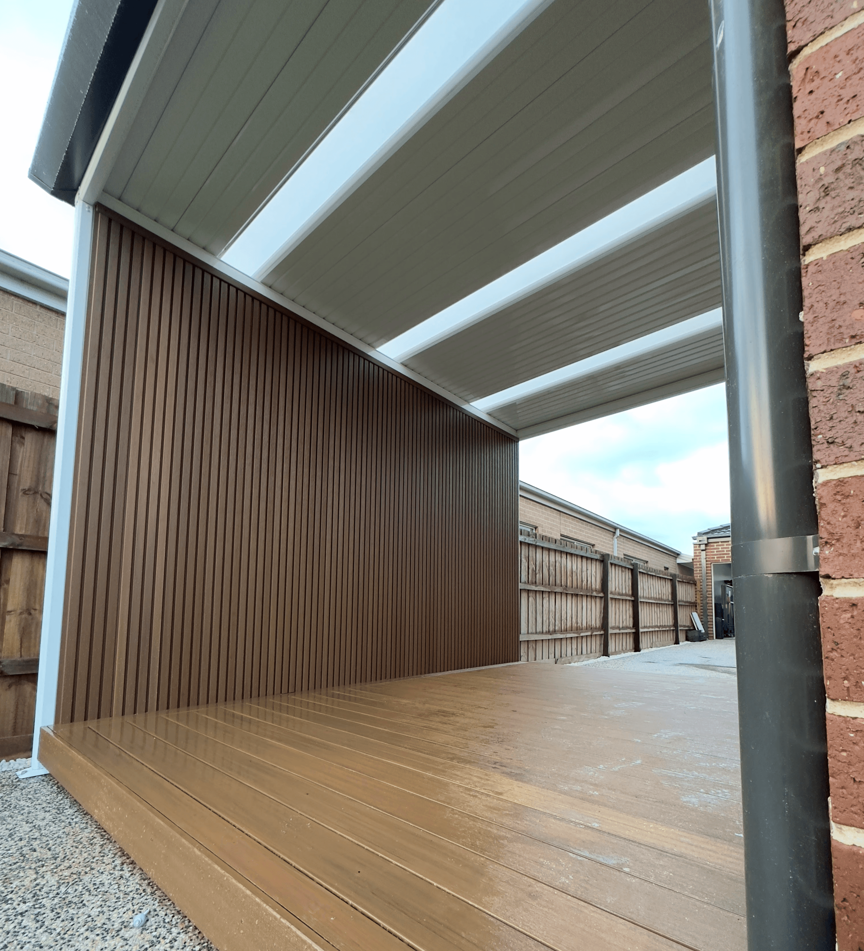 This project in Donnybrook featured a complete backyard transformation focused on creating an inviting outdoor space for entertaining. A1 installed composite decking using premium Inniwood boards in Teak, paired with external cladding that not only elevates the design but also protects against rain and provides excellent insulation. The result is a warm, functional area that blends durability with effortless style.